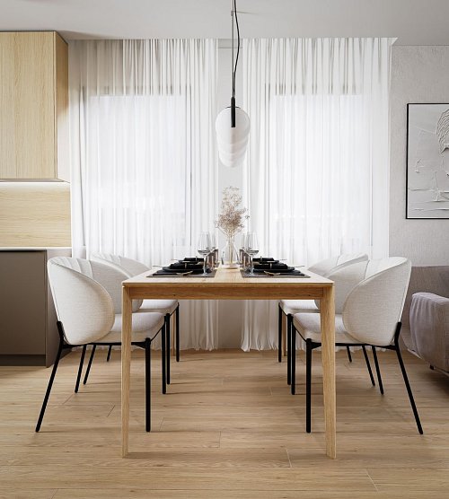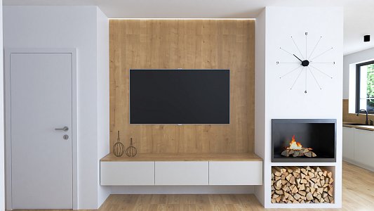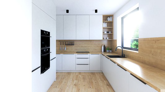 Dennú časť rodinného domu tvorí obývacia izba spojená s kuchyňou a jedálňou. Odkladací priestor pomerne veľkej kuchyne dopĺňa špajza, do ktorej poľahky odložíte všetko potrebné.