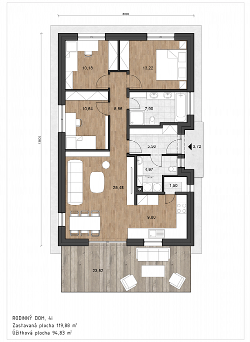 Vyhotovenie domu v prevedení štandard (zahŕňa holodom a naviac) podlahy, interiérové dvere a zárubne, obloženie kúpeľne aj WC, sanitu, kuchyňu aj spotrebiče, nábytok a oveľa viac. Prevedenie štandard vám vieme zabezpečiť mimo projektu firmou Nario.